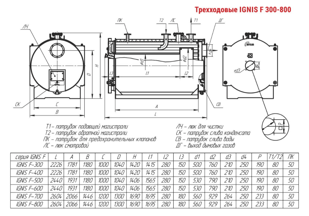 Технические характеристики водогрейного трёхходового котла ARCUS IGNIS F-700