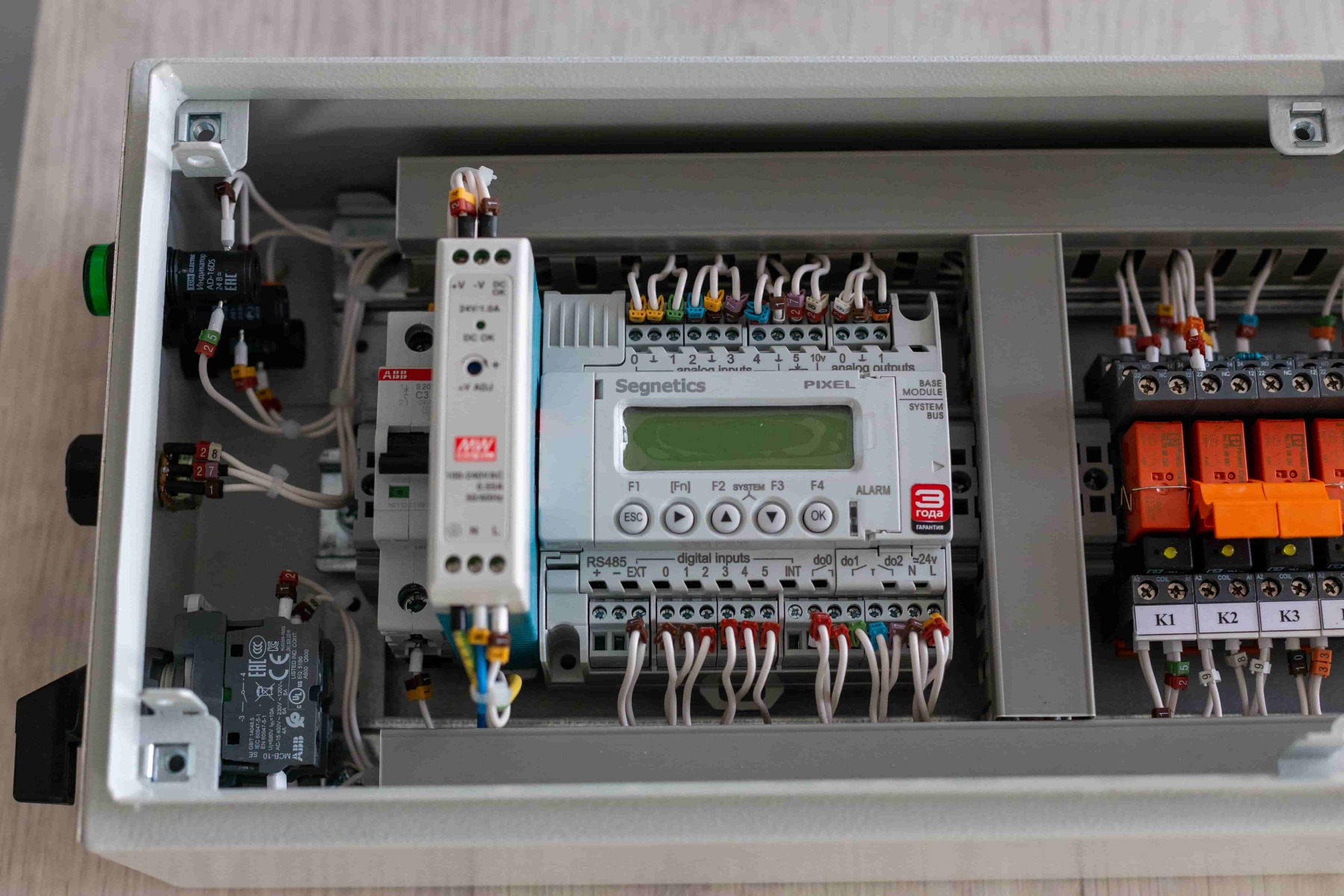 Система автоматики работает на контроллере Segnetics Pixel. Контроллер принимает сигналы с датчиков и выдает управляющие сигналы, соответствующие режиму и алгоритмам работы, на исполнительные устройства и реле для управления технологическим оборудованием. Шкаф имеет степень защиты IP65.